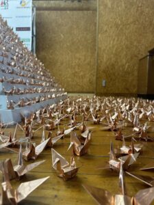 文字通り、銅板の折り鶴を製作しピラミッド状に展示する企画で、私たちも製作に参加いたしました。
